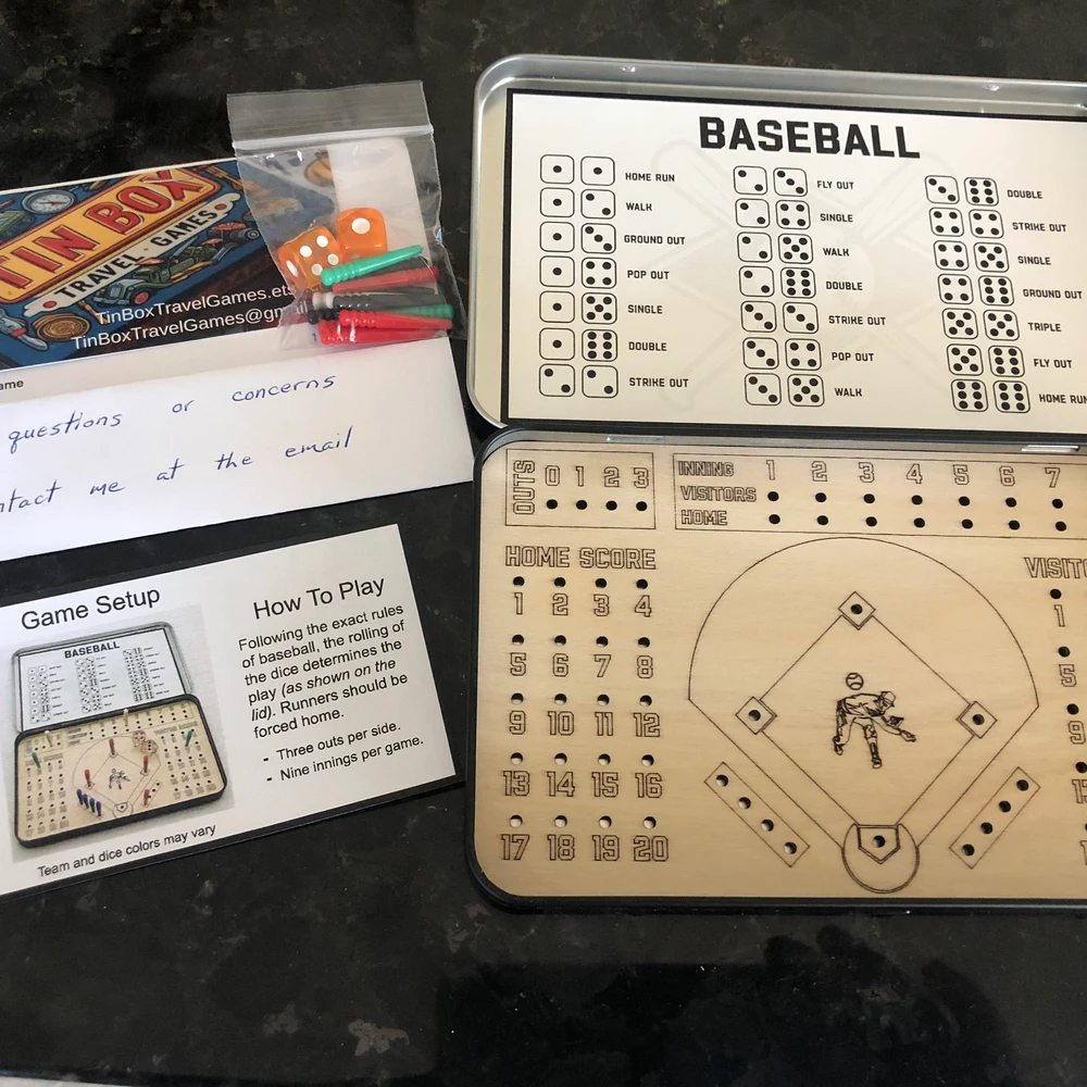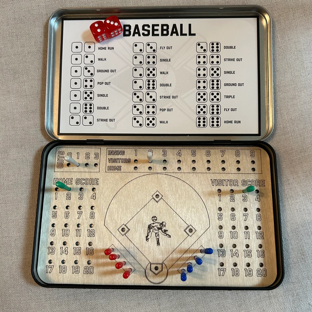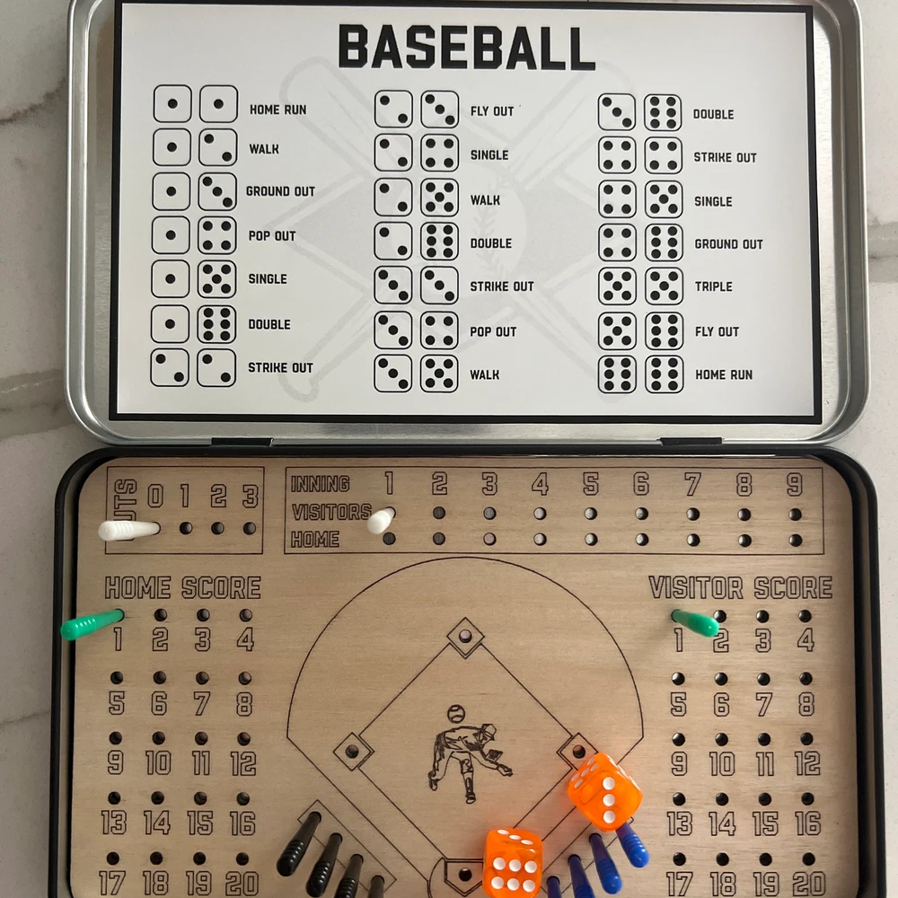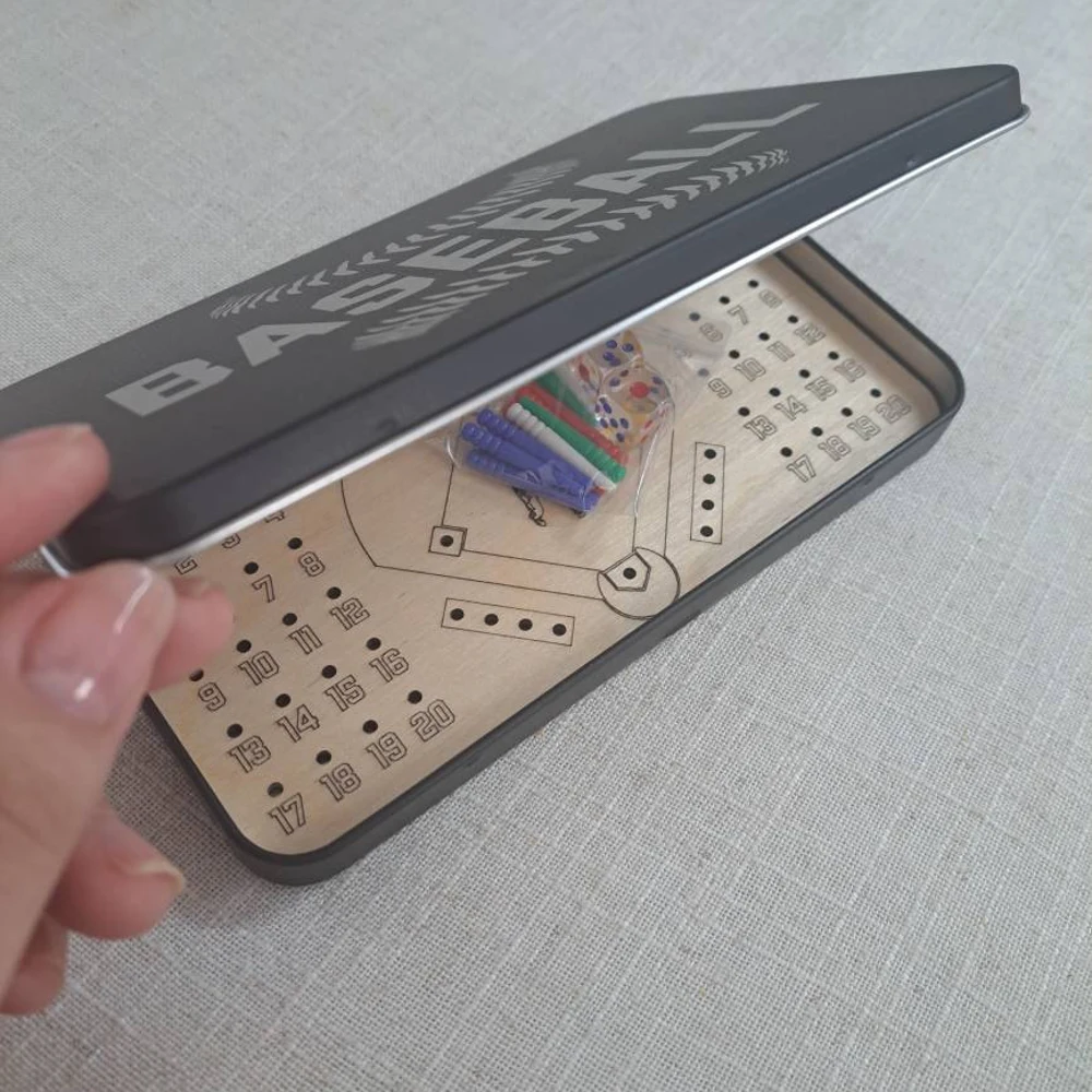 Playing baseball with the luck of dice. Built into a rectangular hinged tin box 178*107*15mm(7.01*4.21*0.59inch) that can be quickly stored away in a purse, backpack, or jacket pocket.