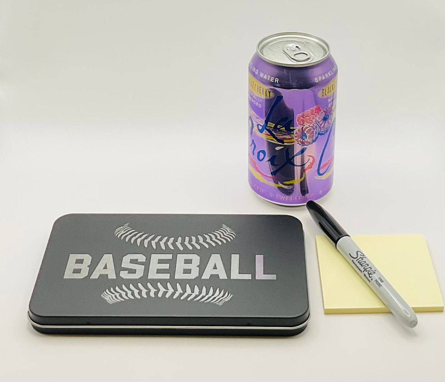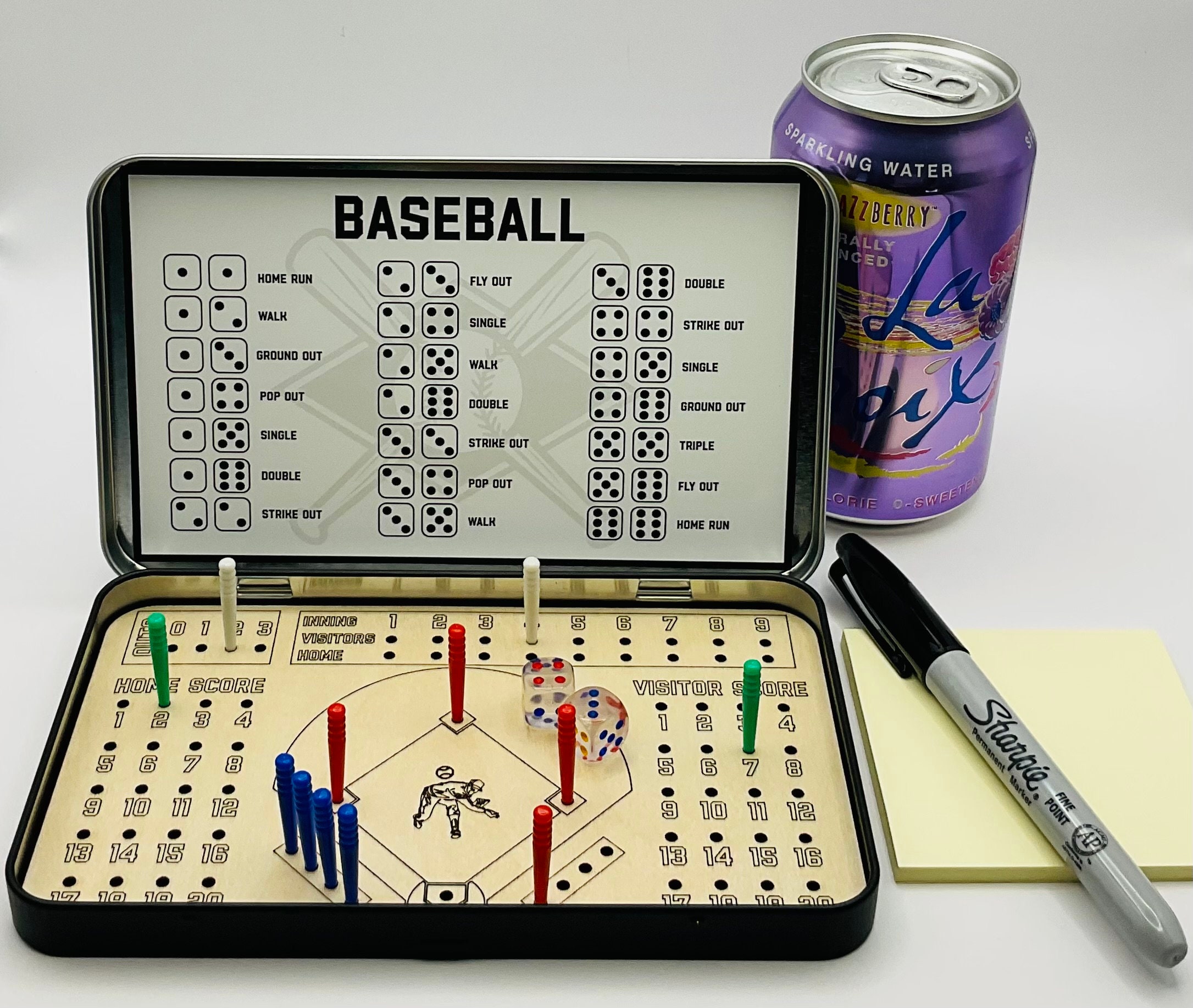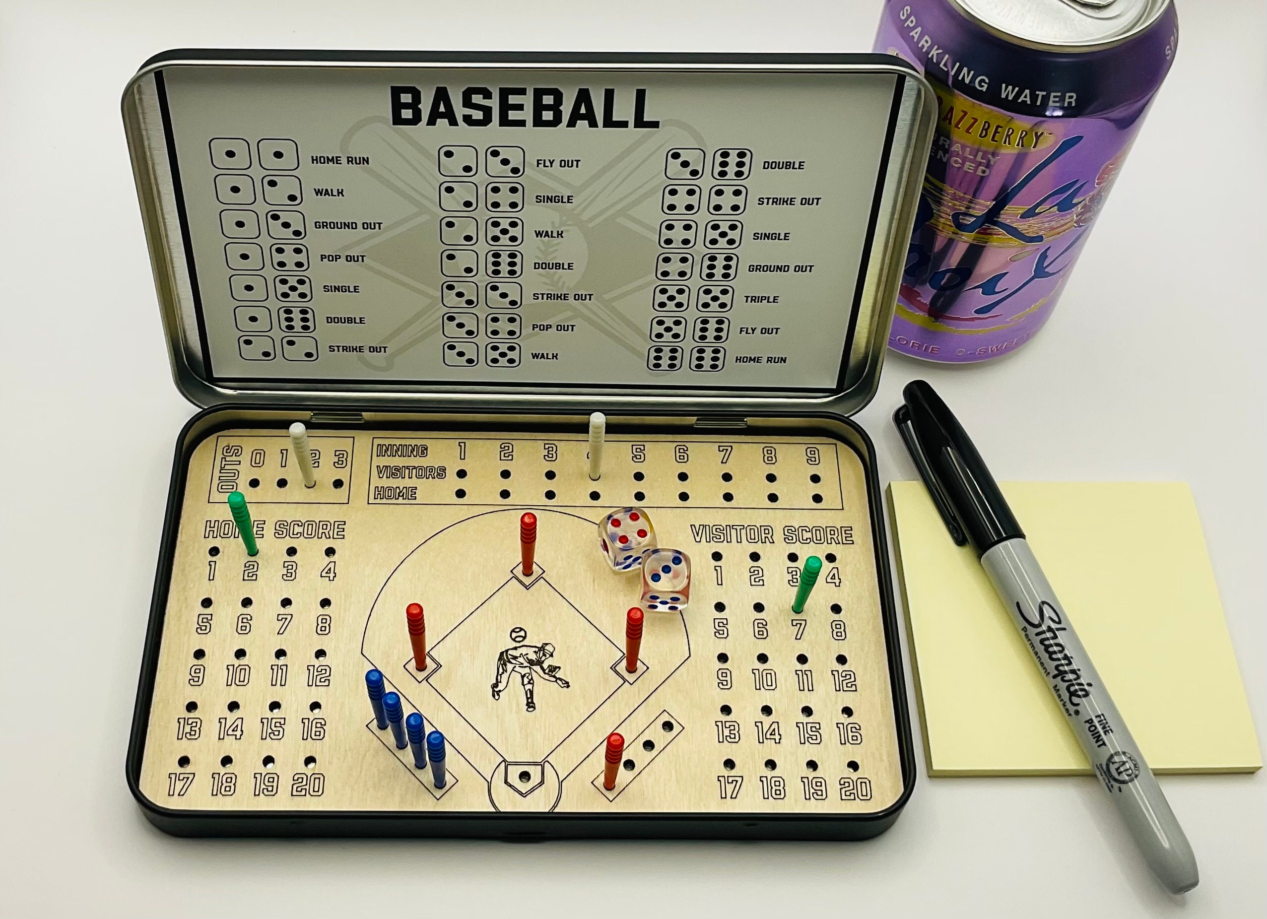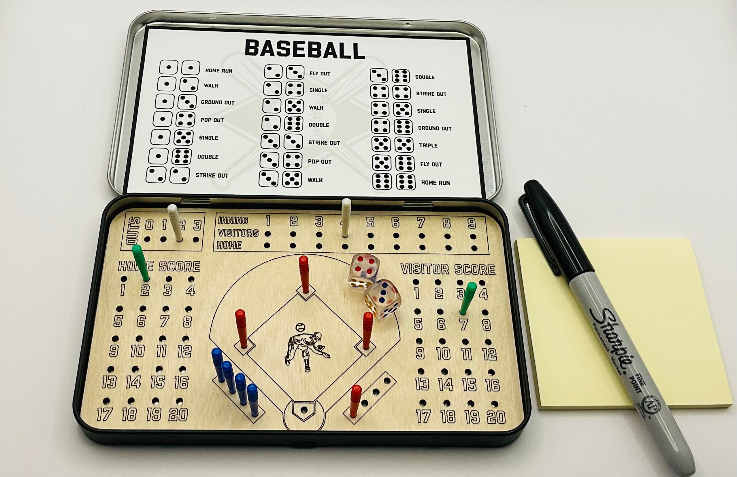 Playing baseball with the luck of dice. Built into a rectangular hinged tin box 178*107*15mm(7.01*4.21*0.59inch) that can be quickly stored away in a purse, backpack, or jacket pocket.