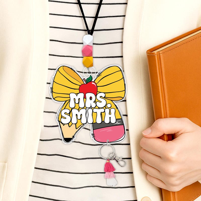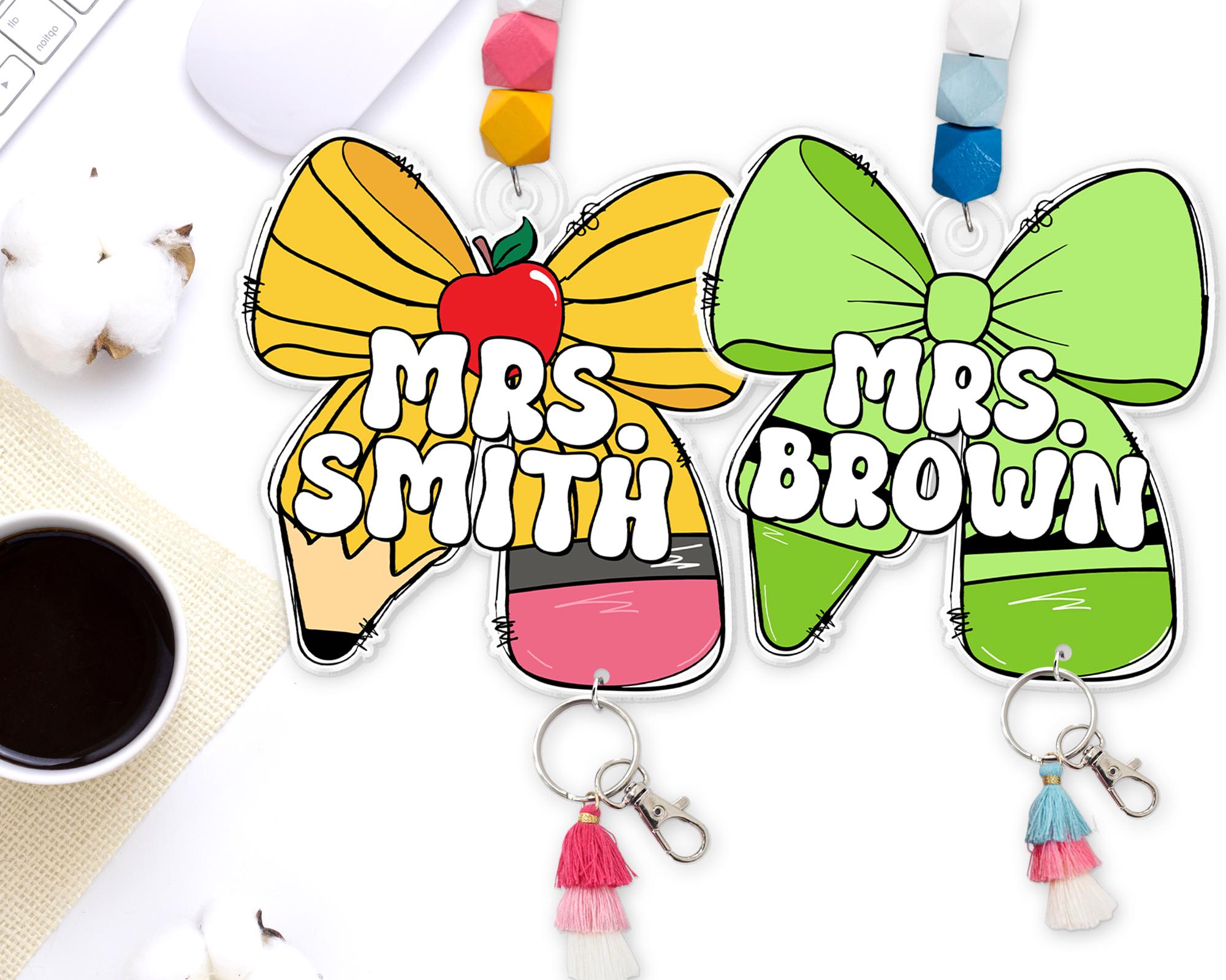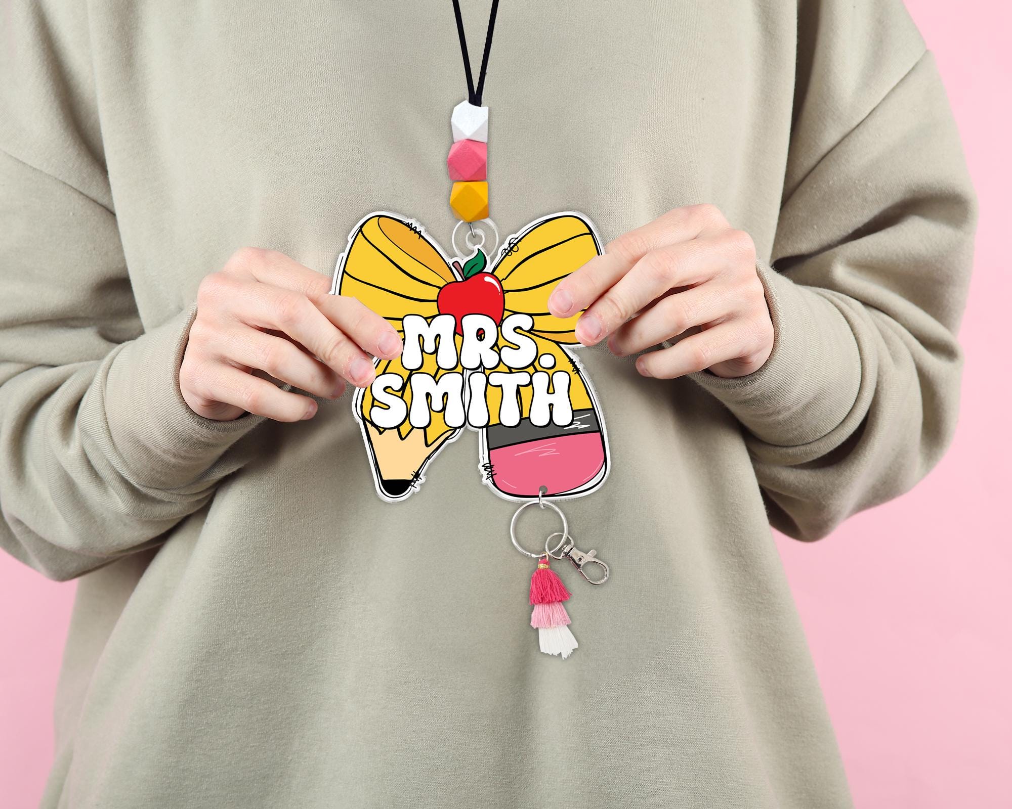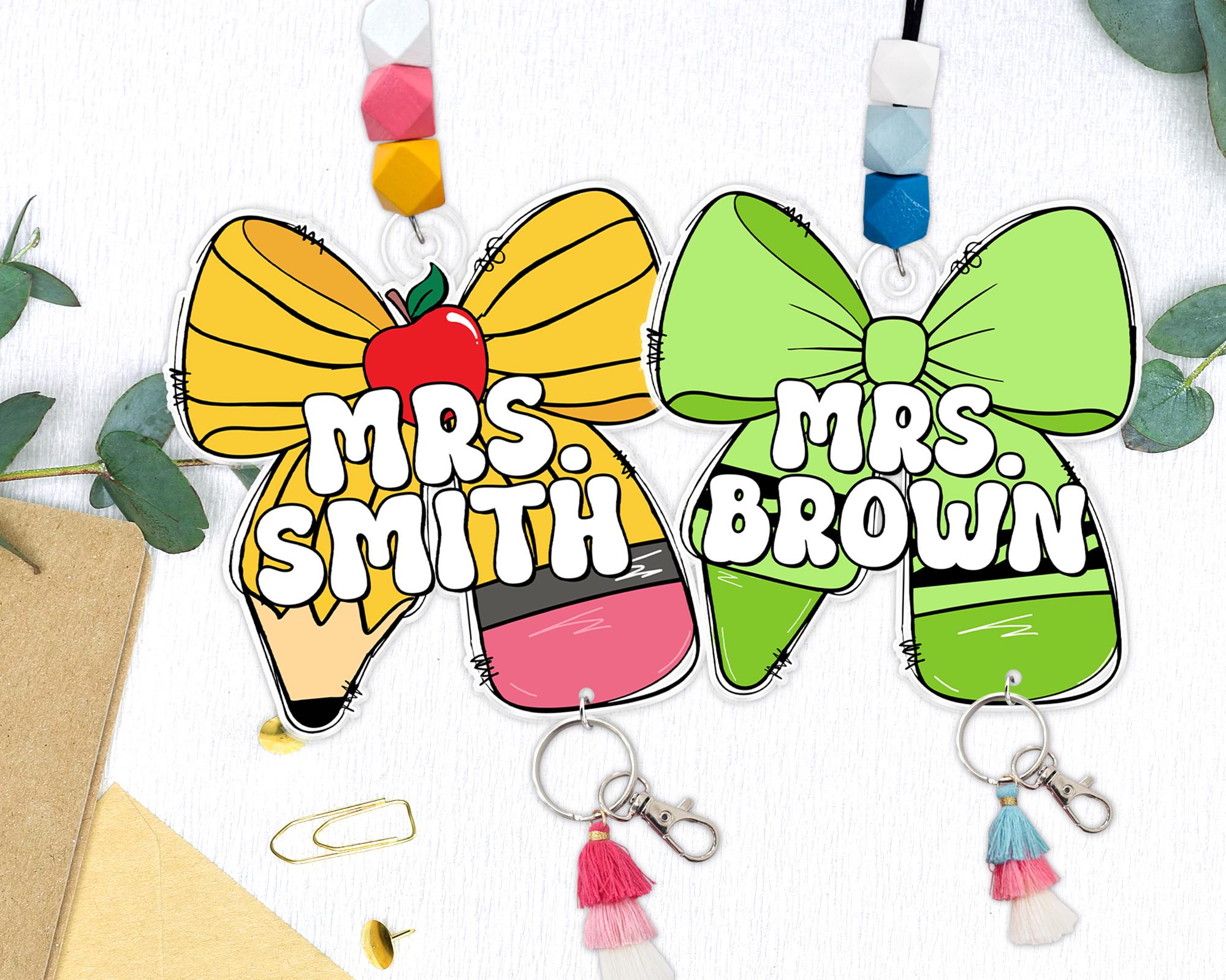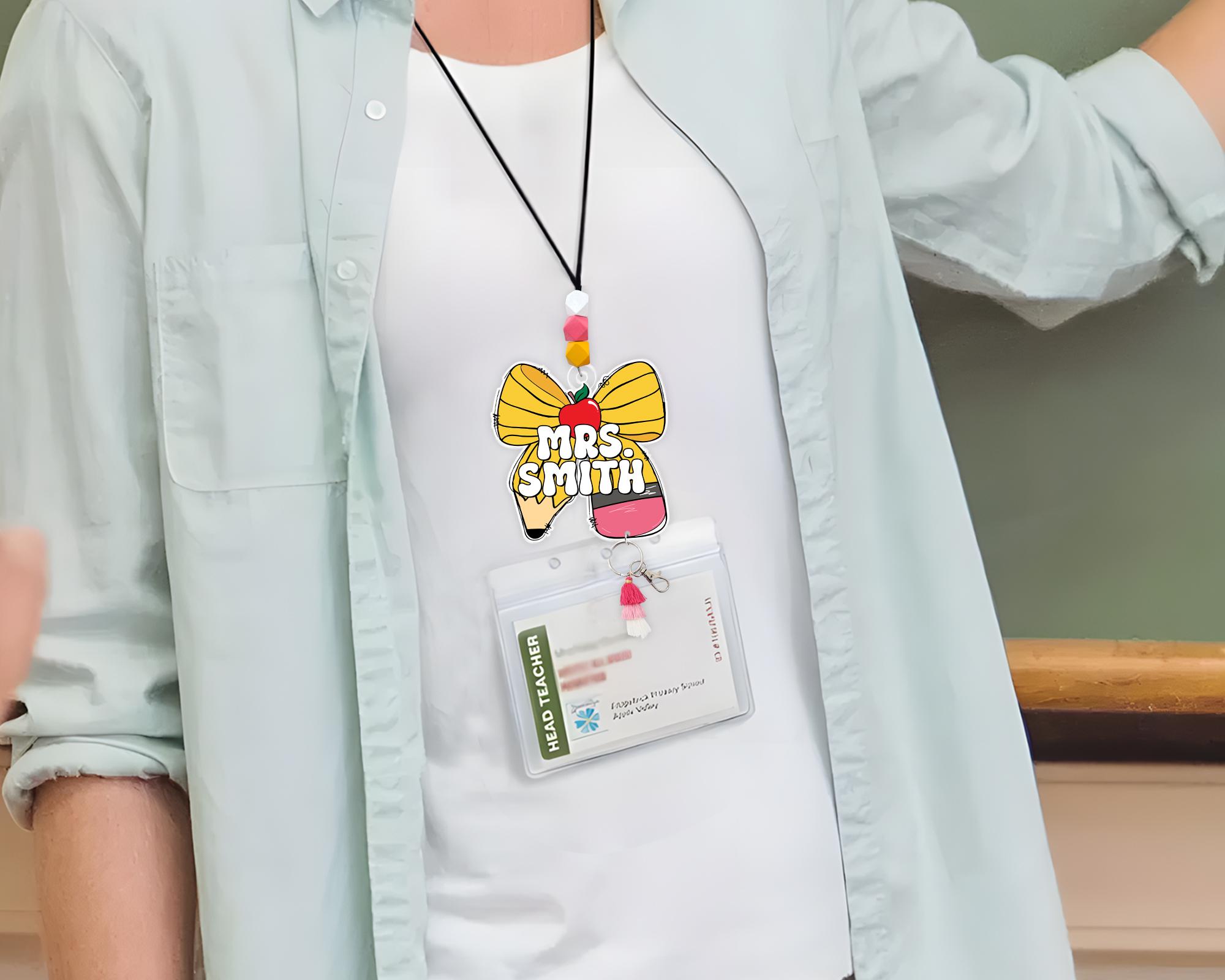 Add a pop of personality to your school day with this adorable bow-shaped teacher lanyard! Designed to combine function and fun, it features a colorful bow with customizable name (e.g., Mrs. Smith) and comes in 8 playful designs inspired by classroom elements like pencils, notebook paper, and bright colors.