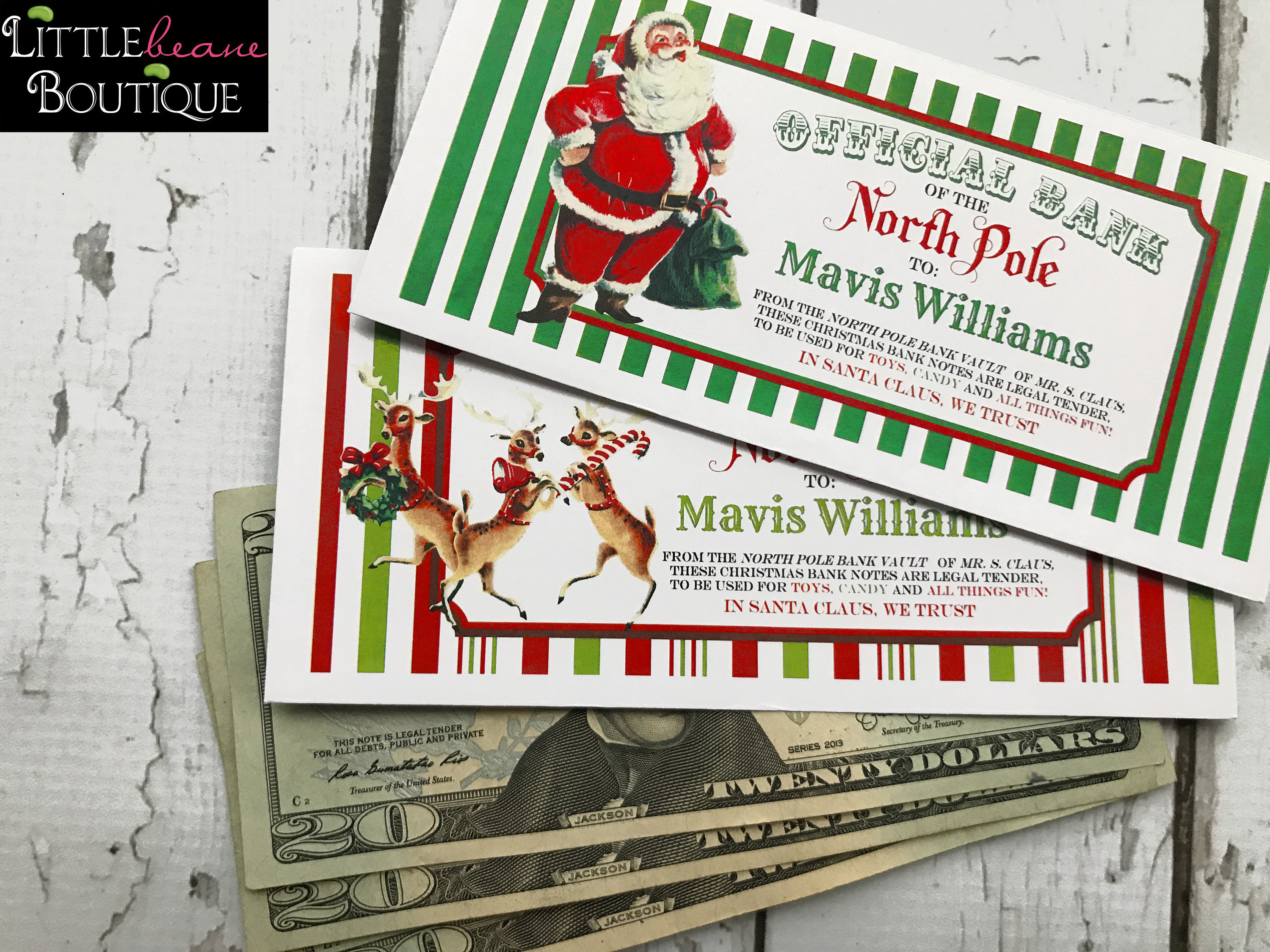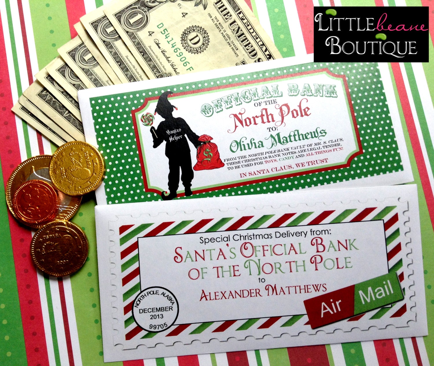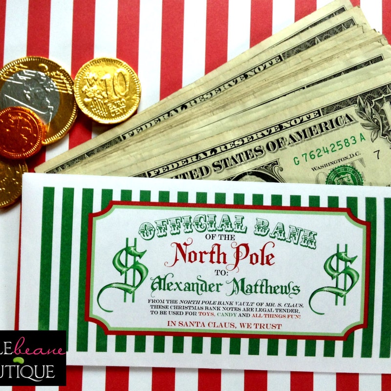 These Personalized Money Envelopes are so cute... and a great way to give money gift and still make is VERY special! they come personalized with the child's name and you can choose from 8 different designs... these are actual money envelopes.. the back flap will have a printed design of Santa's Wax seal! they are also wonderful to add as a stocking stuffer! ** I always go to the bank and request crisp New dollar bills.. my oldest son always gets sooo excited.. .when he has a small stack of money to spend!
